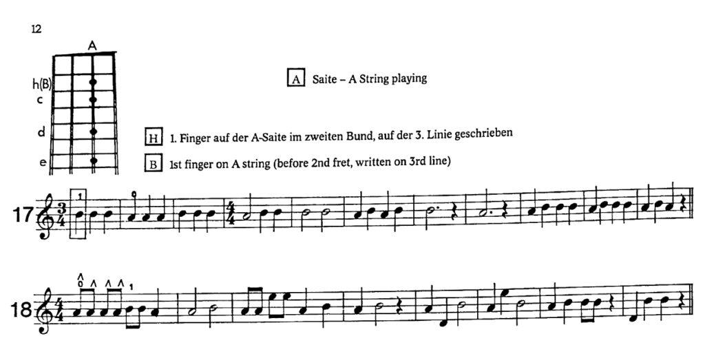 Leibovitz beginnt auf A-Saite und D-Saite mit den Stammtönen, also mit C und F.
