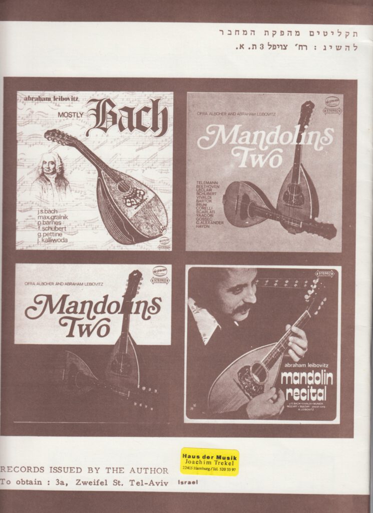 Abraham Leibovitz hat eine Mandolinenschule in Israel veröffentlicht. Der erste Band dieser Schule ist 1981 auch in deutscher Sprache erschienen.