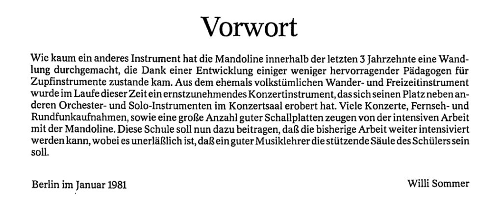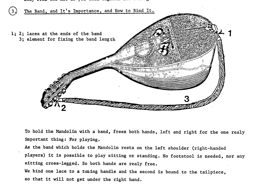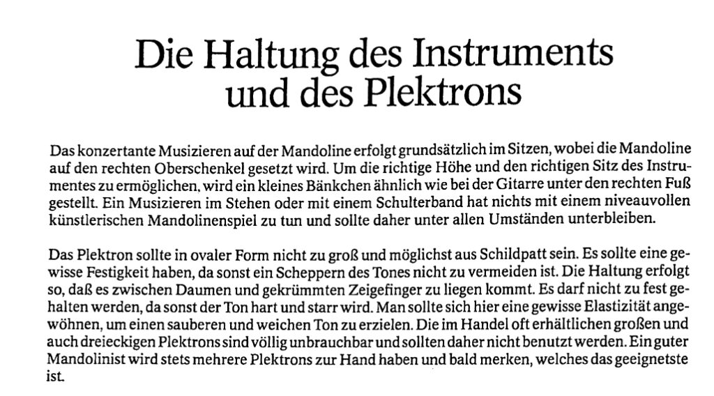 Im Lehrplan folgte ich der traditionellen Methode, mit Tremolo zu beginnen. Ich ließ sie fallen, als ich empirisch feststellte, dass bei den heutigen Jugendlichen eine schnellere Methode ein Muss ist. Ich entwickelte das einfache System, den Wechselschlag zu lehren und ihn dann zum Tremolo zu beschleunigen. Das hat gut funktioniert. Natürlich habe ich eine Menge Lehrtricks gelernt, die in jedem Land anwendbar sind. (Siehe Anfang von Buch I.) Ich habe auch das Halten der Mandoline mit einem Gurt verwendet, mit sehr guten Ergebnissen sowohl für mich (seit 1973) als auch für die Schüler.