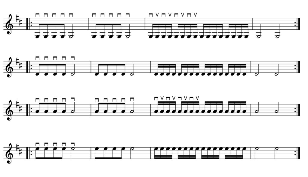 Damit deine Hand die Tremolobewegung lernt fangen wir mit einer kurzen Übung an. Diese Übung spielen wir mit Metronom im Tempo 80, 90, 100, 110, 120 und 130. Bei dieser Übung wird eine Folge von 4×4 Anschlägen im Wechselschlag gespielt, davor gibt es zwei Takte um das Tempo aufzunehmen und einen Takt als Erholung.